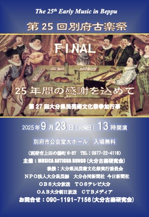 音楽 第25回別府古楽祭 FINAL 会場 別府市公会堂 大ホール 日時 2025年09月23日(火) 開場 12:30 開演 13:00 終演 16:00 入場料 無料 主催 大分古楽研究会 お問い合わせ先 090-1191-7156(大分古楽研究会) 県内外の演奏者による、古楽器によるルネサンスとバロック時代の音楽の演奏 前のページへ戻る