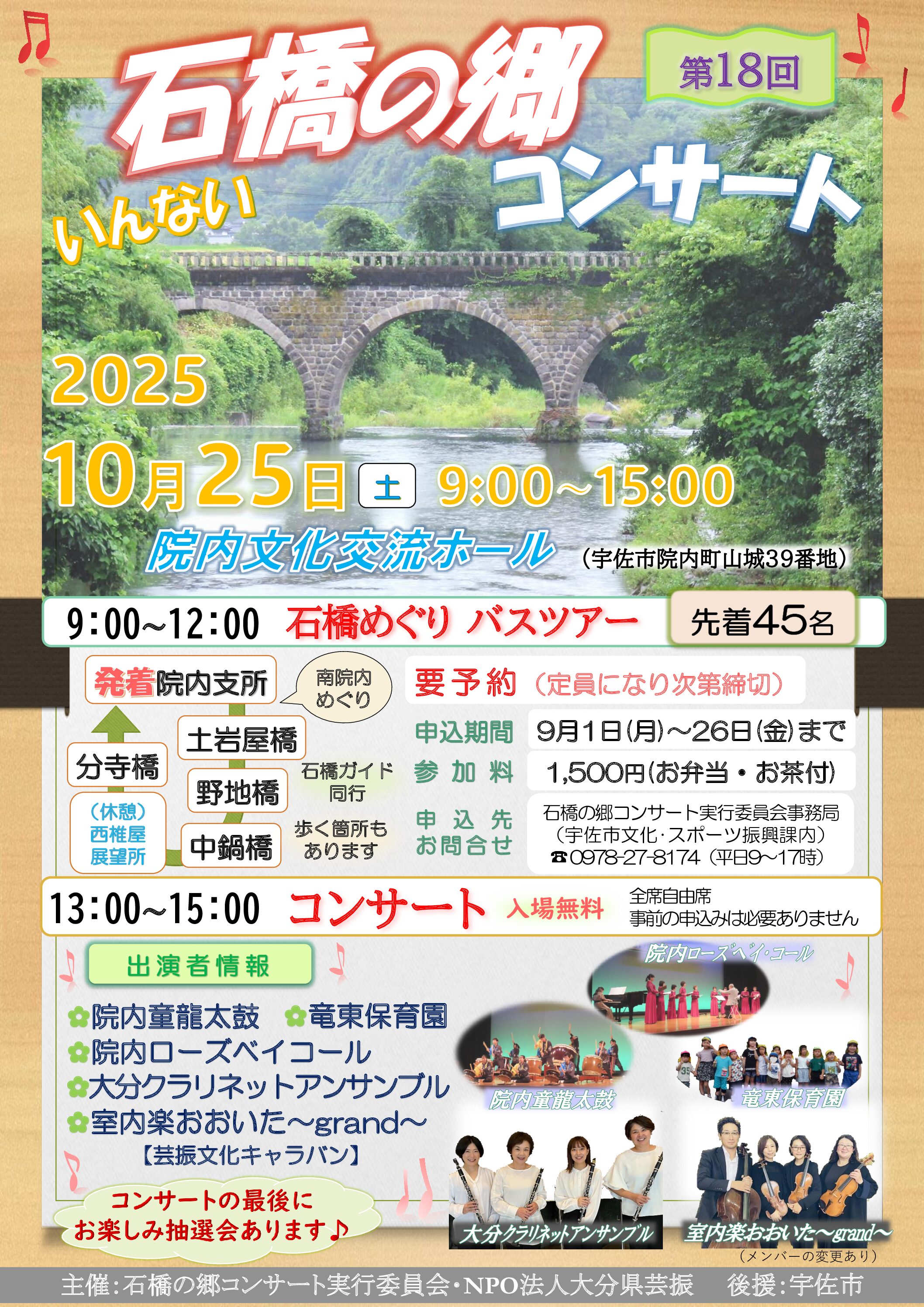 0978-27-8174(石橋の郷コンサート実行委員会事務局/宇佐市文化・スポーツ振興課内)
